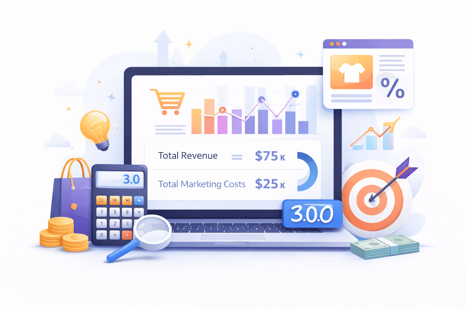 MER (marketing efficiency ratio): Total revenue divided by total marketing spend, giving a blended view of efficiency.